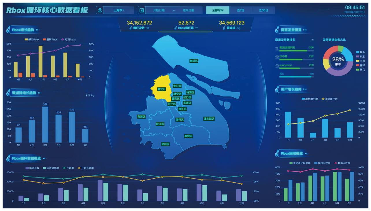 复海数据中台以 “数据驱动运营” 为核心,在管理后台搭建专业大数据模块。通过图表化可视化呈现 R-BOX 循环包装的流转频次、回收率、区域分布等核心数据。助力运营团队直观掌握城市整体运营状况,快速识别流转瓶颈与优化空间,为决策提供数据依据,提升管理效率。