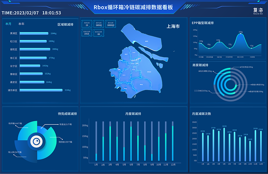 复海构建全链路碳足迹追踪体系,可根据客户需求精准提取包装循环各环节的碳排放数据。通过专业算法生成标准化数据报表,清晰呈现碳减排量、循环次数等核心指标。支持大屏可视化展示,让企业实时掌握环保成果,为绿色供应链管理提供数据支撑,助力碳中和目标达成。